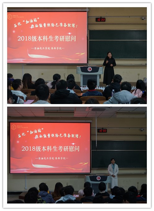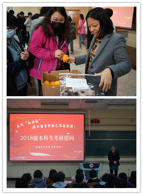 管春英結合自身求學經(jīng)歷激勵考生們在最后沖刺階段靜心聚力,以必勝的信念迎接挑戰(zhàn);鐘璟悉心詢問了各位考研學子的復習進度和心理狀態(tài),并給予針對性的意見;宣慧勉勵大家“一‘研’為定,明年一定研一”,踏上更高的平臺,迎接新的挑戰(zhàn);劉文杰對考研學子的執(zhí)著追夢精神表示肯定,并指出考研是提高學業(yè)水平的重要途徑,對未來發(fā)展起重要作用。最后,學院還為考研學子們發(fā)放石化“加油卡”、石化“加油包”、石化“加油橙”,祝愿所有考研學子心想事成,馬到成功!