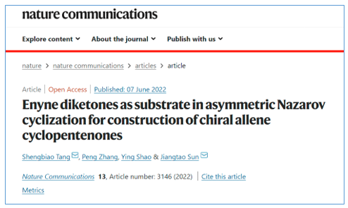 我們發(fā)展了一種金屬-有機(jī)接力催化策略即:金屬銠催化重氮和烯炔醇經(jīng)過串聯(lián)重排反應(yīng)得到烯炔二酮(enyne diketones), 烯炔二酮作為新穎的Nazarov反應(yīng)底物在手性催化劑的催化下,高對(duì)映和非對(duì)映選擇性制備一系列手性聯(lián)烯環(huán)戊烯酮。