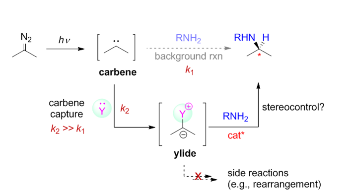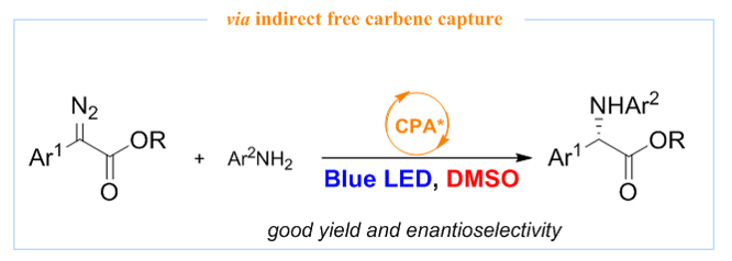 解決方案:如何抑制背景反應(yīng)以提高有機(jī)催化的自由卡賓轉(zhuǎn)移反應(yīng)的立體選擇性,是該研究體系所面臨的最重要的科學(xué)問(wèn)題與挑戰(zhàn)?;谖覀冋n題組在有機(jī)催化的卡賓類似物(硫葉立德)N-H插入反應(yīng)的研究興趣,我們首先研究了有機(jī)催化的可見(jiàn)光介導(dǎo)條件下的自由卡賓不對(duì)稱N-H插入反應(yīng),通過(guò)適當(dāng)?shù)姆磻?yīng)條件優(yōu)化,我們發(fā)現(xiàn)在手性磷酸催化劑存在下,反應(yīng)最高只能獲得具有中等的立體選擇性的N-H插入產(chǎn)物?;诖饲捌谘芯拷Y(jié)果,我們?cè)O(shè)想能否通過(guò)自由卡賓的間接捕獲思路,即利用含孤對(duì)電子的化合物作為添加劑捕獲可見(jiàn)光激發(fā)產(chǎn)生的自由卡賓而原位形成新的葉立德中間體,該葉立德中間體需順利參與手性酸催化的不對(duì)稱N-H插入反應(yīng),從而提高反應(yīng)的立體選擇性(思路見(jiàn)下圖)。但此思路中,各步反應(yīng)速率的匹配性以及添加劑與催化反應(yīng)體系的兼容性是需要額外考慮的問(wèn)題。