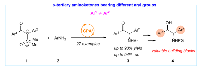 在進(jìn)行上述卡賓捕獲反應(yīng)時(shí),我們發(fā)現(xiàn)之前從未應(yīng)用于不對(duì)稱催化反應(yīng)的兩側(cè)含芳基取代的氧化硫葉立德1在手性酸催化下可順利進(jìn)行N-H插入反應(yīng)而獲得alpha-氨基酮3,文獻(xiàn)中已報(bào)道的該類型alpha-氨基酮的有效的不對(duì)稱催化合成方法很少,究其原因在于手性中心的不穩(wěn)定?;诖耍覀兺ㄟ^(guò)手性磷酸催化的氧化硫葉立德的不對(duì)稱N-H插入反應(yīng)實(shí)現(xiàn)了該類氨基酮的不對(duì)稱催化合成。我們的方法尤其適合于合成含不同芳基取代基的alpha-氨基酮3,其在藥物合成,配體設(shè)計(jì),手性輔基設(shè)計(jì)等領(lǐng)域具有重要的應(yīng)用價(jià)值。
