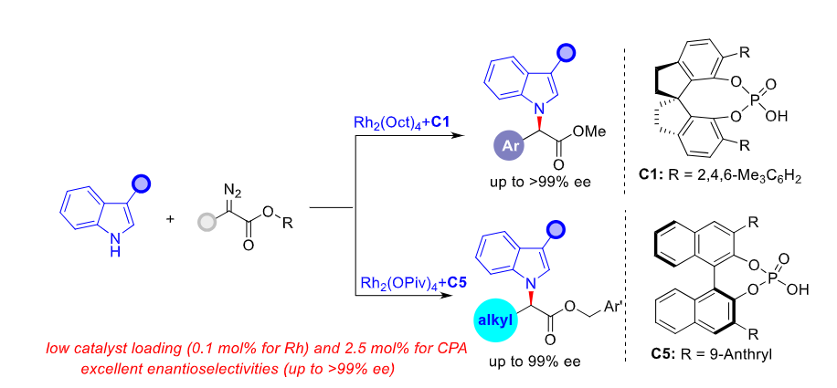 本課題組用0.1mol%的銠催化劑和2.5mol%的手性膦酸,高效的實(shí)現(xiàn)了吲哚的不對(duì)稱(chēng)N-H鍵插入反應(yīng)。用芳基重氮和烷基重氮作為親電試劑前體,通過(guò)銠催化劑和膦酸的篩選,首次實(shí)現(xiàn)了芳基重氮和烷基重氮羧酸酯的高對(duì)應(yīng)選擇性N-H鍵插入反應(yīng)。反應(yīng)具有很好的底物實(shí)用性,高效的催化活性。產(chǎn)物的ee值最高>99%。
