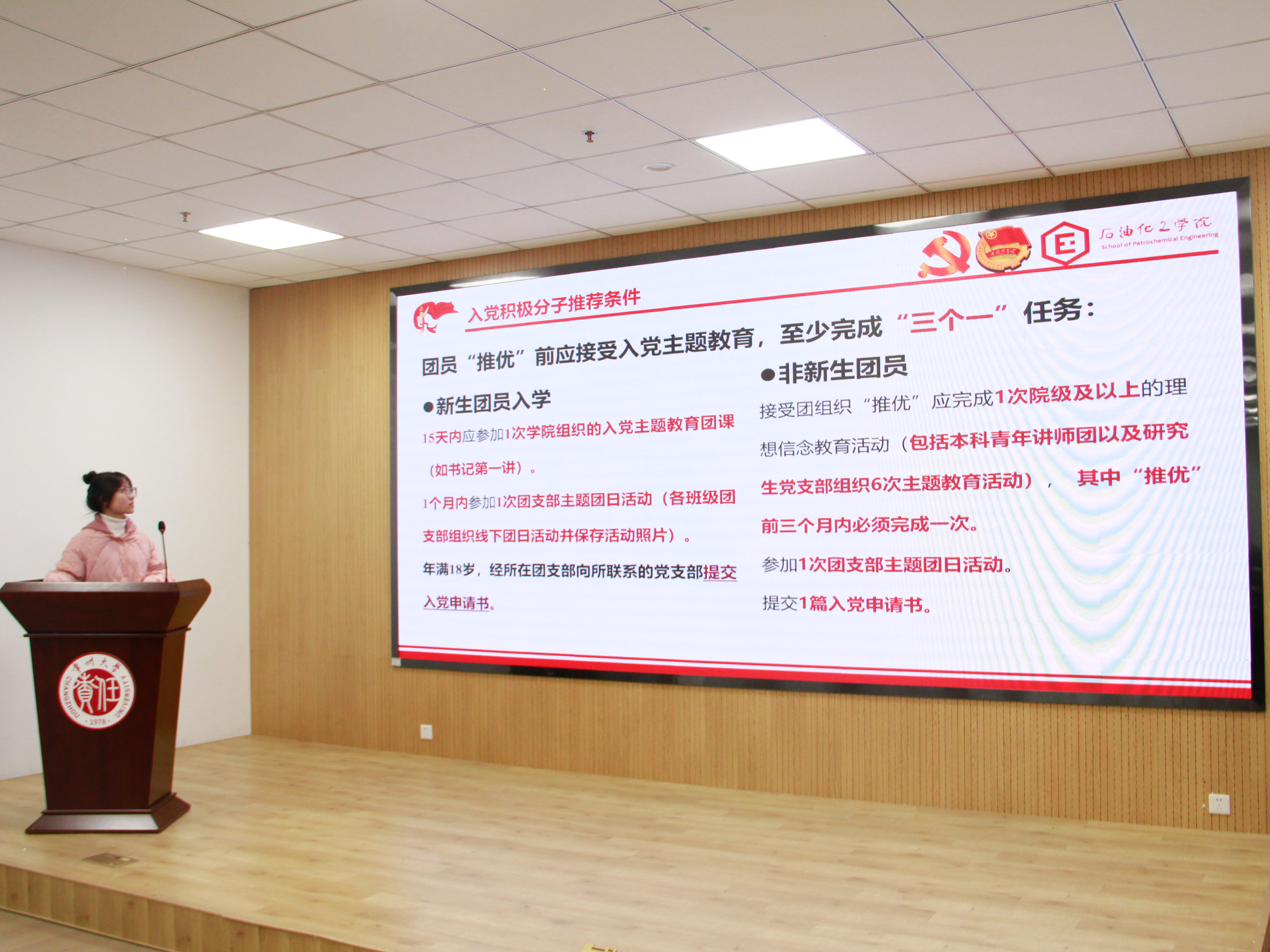 首先,余琳琳概述了常州大學(xué)共青團(tuán)推優(yōu)入黨工作實(shí)施辦法,并詳細(xì)介紹了入黨積極分子和發(fā)展對象的推薦條件及推優(yōu)工作程序。隨后,晏春風(fēng)根據(jù)《常州大學(xué)發(fā)展黨員工作實(shí)施細(xì)則》向同學(xué)們介紹了黨員發(fā)展流程和入黨材料填寫要求。最后,趙彩霞對黨員發(fā)展的時(shí)間線做進(jìn)一步梳理和總結(jié),鼓勵(lì)團(tuán)員們向身邊的黨員看齊,積極發(fā)揮先鋒模范作用。勤奮科研,提高創(chuàng)新能力,力爭將所學(xué)所專與國家需求相結(jié)合;甘于奉獻(xiàn),增強(qiáng)服務(wù)意識,主動為周邊老師同學(xué)等提供幫助支持,以實(shí)際行動向黨組織靠攏。