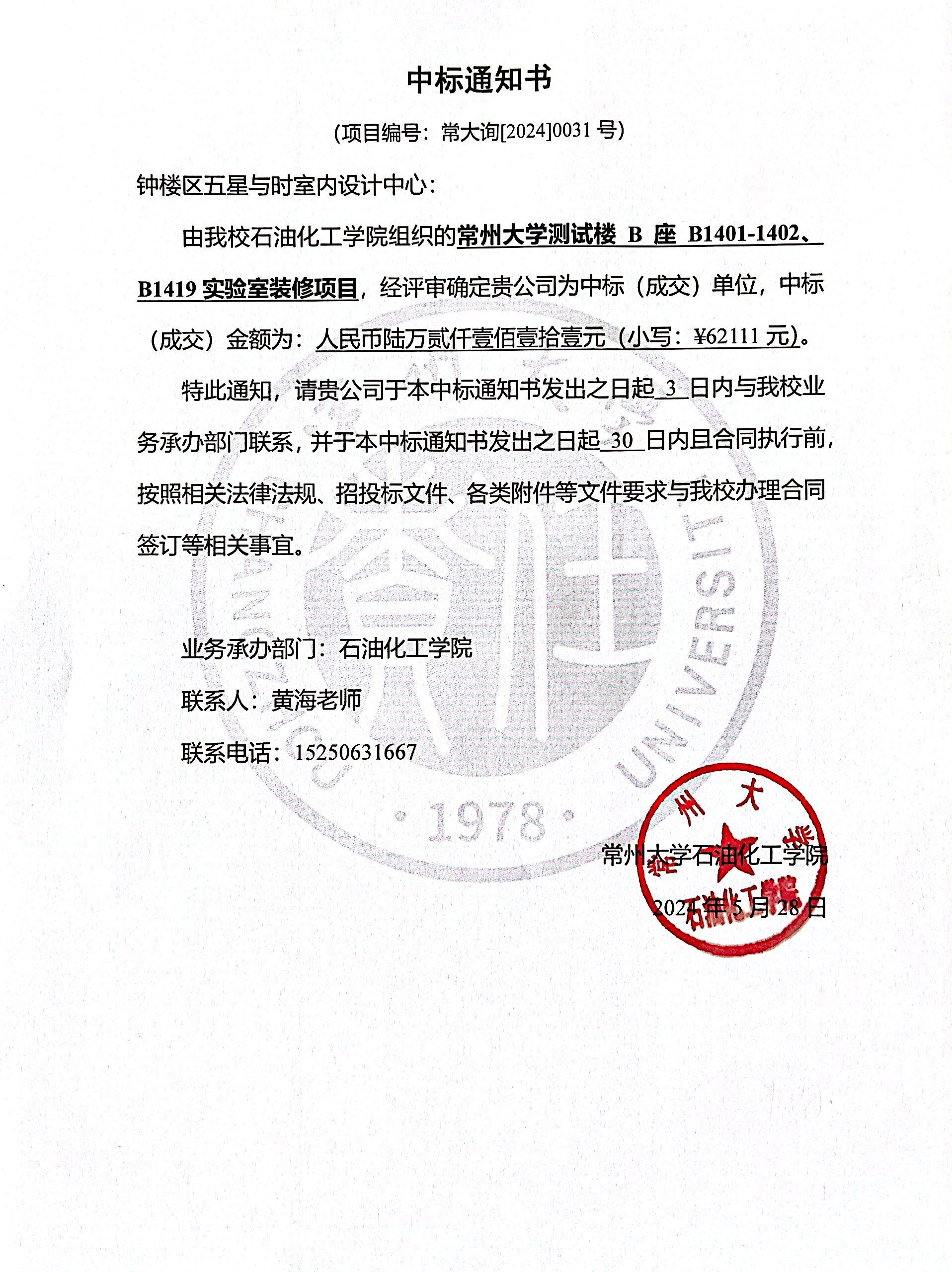 常州大學對測試樓B座B1401-1402、B1419實驗室裝修項目進行詢價采購,按規(guī)定程序進行了開標、評標、定標,現(xiàn)將本次項目成交結(jié)果公告如下: