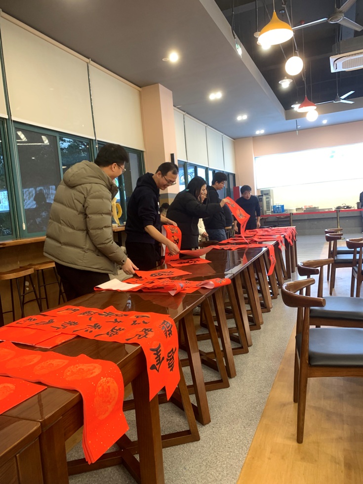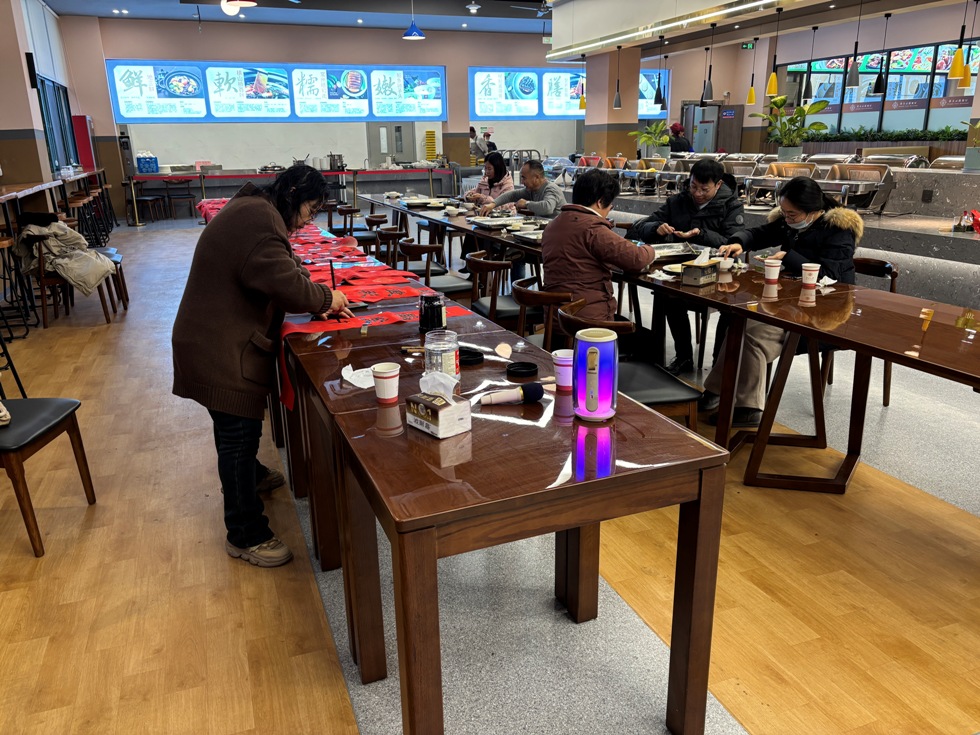 活動現(xiàn)場,董燕敏老師為在場教職工現(xiàn)場寫春聯(lián)、送“?!弊?,一幅幅濃濃年味的喜慶“春聯(lián)”和“福”字,還未晾干,就被熱情的職工們“一搶而空”。