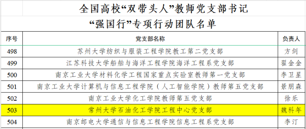 近日,教育部辦公廳、省委教育工委分別公布了全國、全省高?!半p帶頭人”教師黨支部書記“強(qiáng)國行”專項(xiàng)行動(dòng)團(tuán)隊(duì)名單。我校石油化工學(xué)院工程中心黨支部成功入選全國高校“雙帶頭人”教師黨支部書記“強(qiáng)國行”專項(xiàng)行動(dòng)團(tuán)隊(duì)。