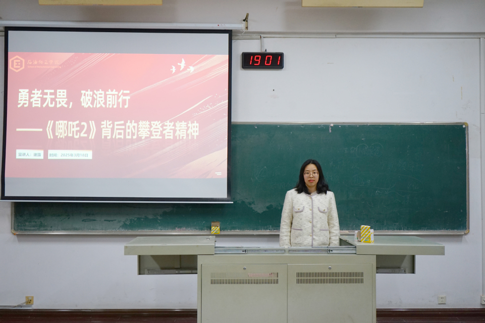講座上,楊帆以《哪吒2》突破百億票房為切入角,指出《哪吒2》的大火啟示我們應(yīng)積極培養(yǎng)創(chuàng)新意識,勇于實踐,將創(chuàng)新精神融入學習和生活的方方面面,為個人和社會創(chuàng)造更大的價值。接著謝露向同學們引出《哪吒2》背后的攀登者精神——刻苦鉆研、技術(shù)革新、團隊精神以及文化傳承。她指出作為大學生要堅守信念,培養(yǎng)鉆研探索的精神。