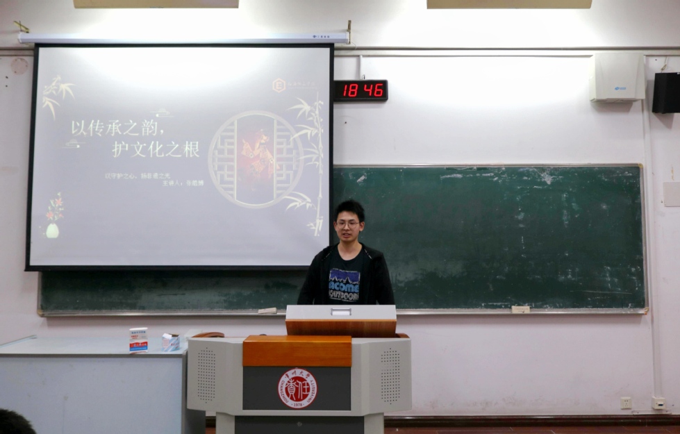 鄧玟婕從非遺的分類(lèi)、價(jià)值、現(xiàn)狀與挑戰(zhàn)三方面展開(kāi),將“傳承非遺”作為情感共鳴和時(shí)代使命,強(qiáng)調(diào)了傳承非遺的重要性;張皓博重點(diǎn)講述了非遺的現(xiàn)狀轉(zhuǎn)型,包括跨界融合、3D掃描技術(shù)、科技賦能等內(nèi)容,呼吁同學(xué)們參與非遺保護(hù)活動(dòng),成為文化自信的踐行者,努力推動(dòng)中華優(yōu)秀傳統(tǒng)文化創(chuàng)造性轉(zhuǎn)化,為非遺傳承注入青春力量。
