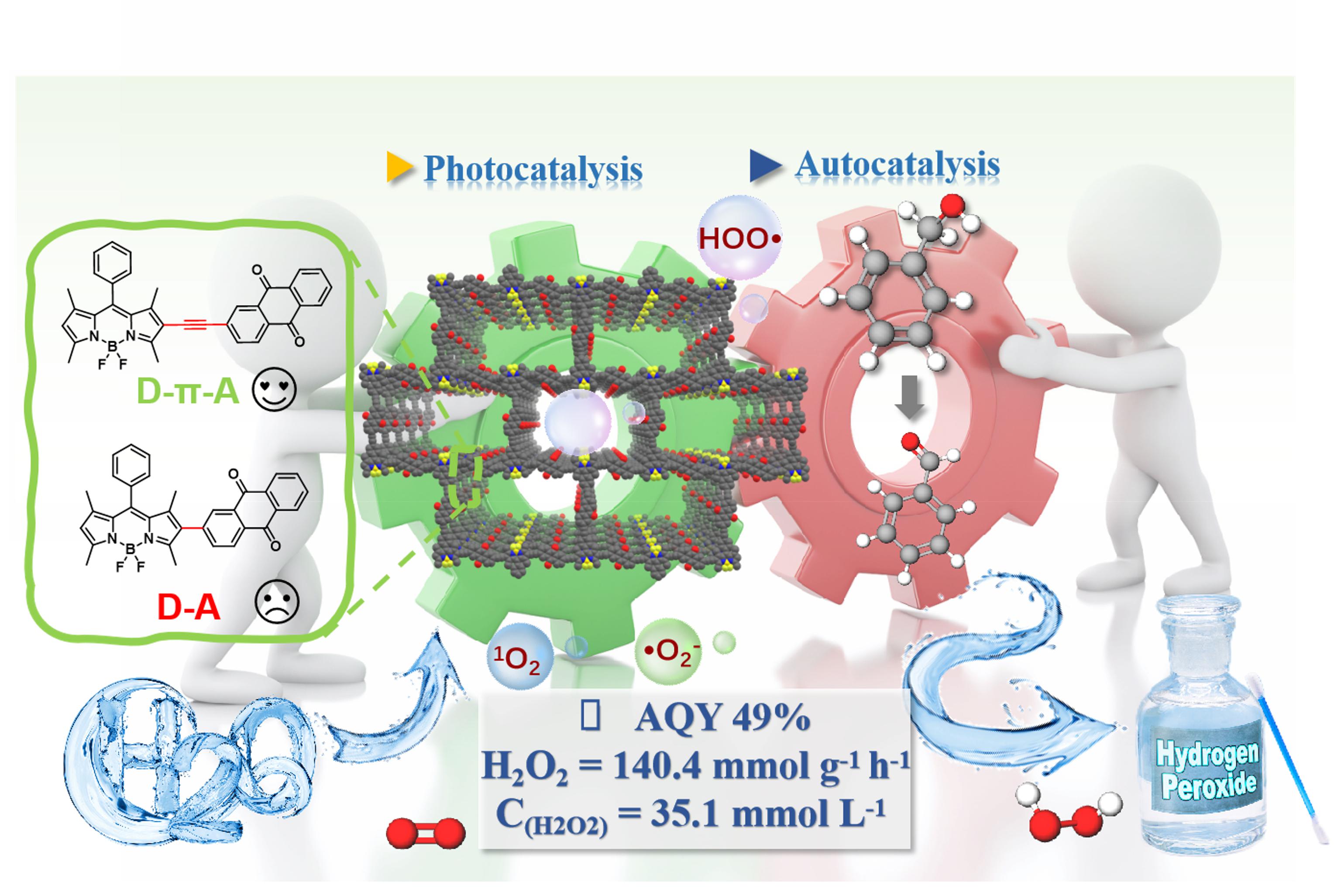 傳統(tǒng)蒽醌法生產(chǎn)過氧化氫(H2O2)因高能耗和環(huán)境污染問題備受關注,亟需尋找更高效、環(huán)保的替代方法。近期,顧培洋教授團隊和路建美教授團隊合作在人工光合作用生產(chǎn)H2O2領域取得重要進展,開發(fā)出一種新型D-π-A型共軛多孔聚合物光催化劑,顯著提升了H2O2的生成效率,為可持續(xù)能源轉(zhuǎn)換和環(huán)境保護提供了新思路。