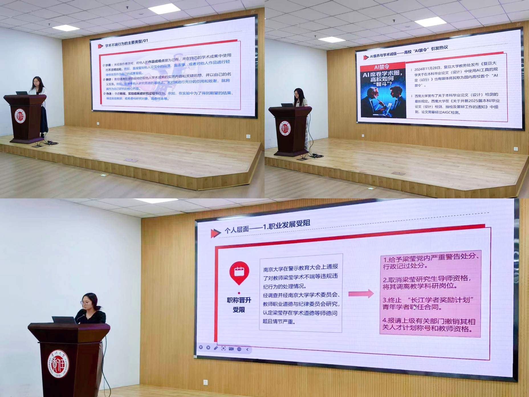 活動(dòng)中,李欣庭根據(jù)《高等學(xué)校預(yù)防與處理學(xué)術(shù)不端行為辦法》,介紹了抄襲、數(shù)據(jù)造假、文獻(xiàn)篡改等七種類型的學(xué)術(shù)不端行為及其界定標(biāo)準(zhǔn);韓明楊結(jié)合近年來通報(bào)的學(xué)術(shù)不端典型案例,揭示學(xué)術(shù)不端對(duì)個(gè)人、學(xué)術(shù)共同體及社會(huì)信任的嚴(yán)重危害;唐一航聚焦AI技術(shù)浪潮,深入探討其應(yīng)用帶來的學(xué)術(shù)誠信新挑戰(zhàn),并分享數(shù)字化時(shí)代堅(jiān)守學(xué)術(shù)底線的實(shí)踐路徑。
