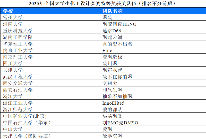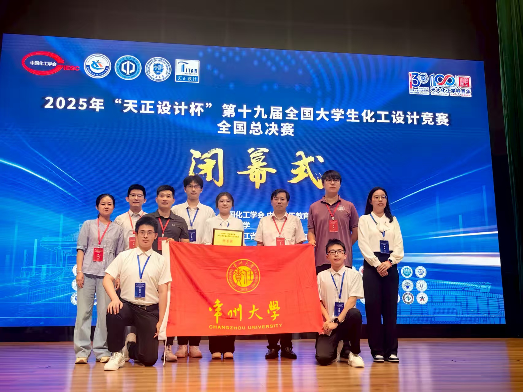 8月11日至8月17日,2025年“天正設計杯”第十九屆全國大學生化工設計競賽總決賽在天津大學舉行。常州大學石油化工學院砜硫隊作品《福建凱美特年產(chǎn)1.5萬噸二甲基亞砜項目》(參賽隊員:常佩源、張皓博、許正梁、薛晴、謝露;指導老師:石劍、馬江權、謝德華、周滿、黎珊)經(jīng)過江蘇省省賽、華東賽區(qū)選拔賽以及全國總決賽的激烈角逐,斬獲第十九屆全國大學生化工設計競賽特等獎。