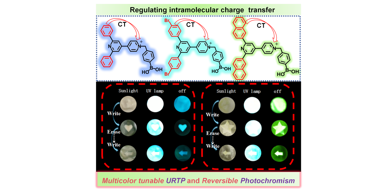 動(dòng)態(tài)光致變色長壽命室溫磷光材料是一類兼具結(jié)構(gòu)色變化與發(fā)光特性可調(diào)(強(qiáng)度、壽命及顏色)的智能光學(xué)材料,在高級(jí)防偽、信息加密、傳感等領(lǐng)域具有巨大應(yīng)用潛能。然而,如何將光致變色和長壽命室溫磷光功能有效整合到單一聚合物體系,以構(gòu)筑出多色可調(diào)的高性能的動(dòng)態(tài)光致變色長壽命室溫磷光聚合物,仍面臨巨大挑戰(zhàn)。我們研究團(tuán)隊(duì)策略性地將具有可調(diào)控分子內(nèi)電荷轉(zhuǎn)移(ICT)能力的非線性吡啶鎓單元嵌入剛性聚乙烯醇(PVA)基質(zhì)中,成功地開發(fā)了多色可調(diào)的動(dòng)態(tài)光致變色長壽命室溫磷光聚合物。