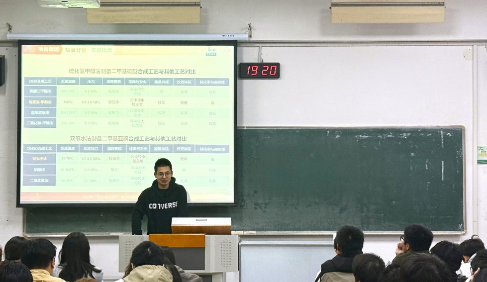 為幫助同學(xué)們拓寬專業(yè)視野、提升專業(yè)實(shí)踐能力,11月11日晚,“石化青年說”系列講座第二講在W1207教室順利舉行,講座由化工224班常佩源與化工226班張皓博兩位同學(xué)擔(dān)任主講。他們所在的常州大學(xué)“砜硫隊(duì)”,曾憑借“福建凱美特氣體有限公司分公司年產(chǎn)1.5萬噸二甲基亞砜項(xiàng)目”的出色設(shè)計(jì),在2025年“天正設(shè)計(jì)杯”第十九屆全國大學(xué)生化工設(shè)計(jì)競(jìng)賽中脫穎而出,斬獲全國特等獎(jiǎng)。