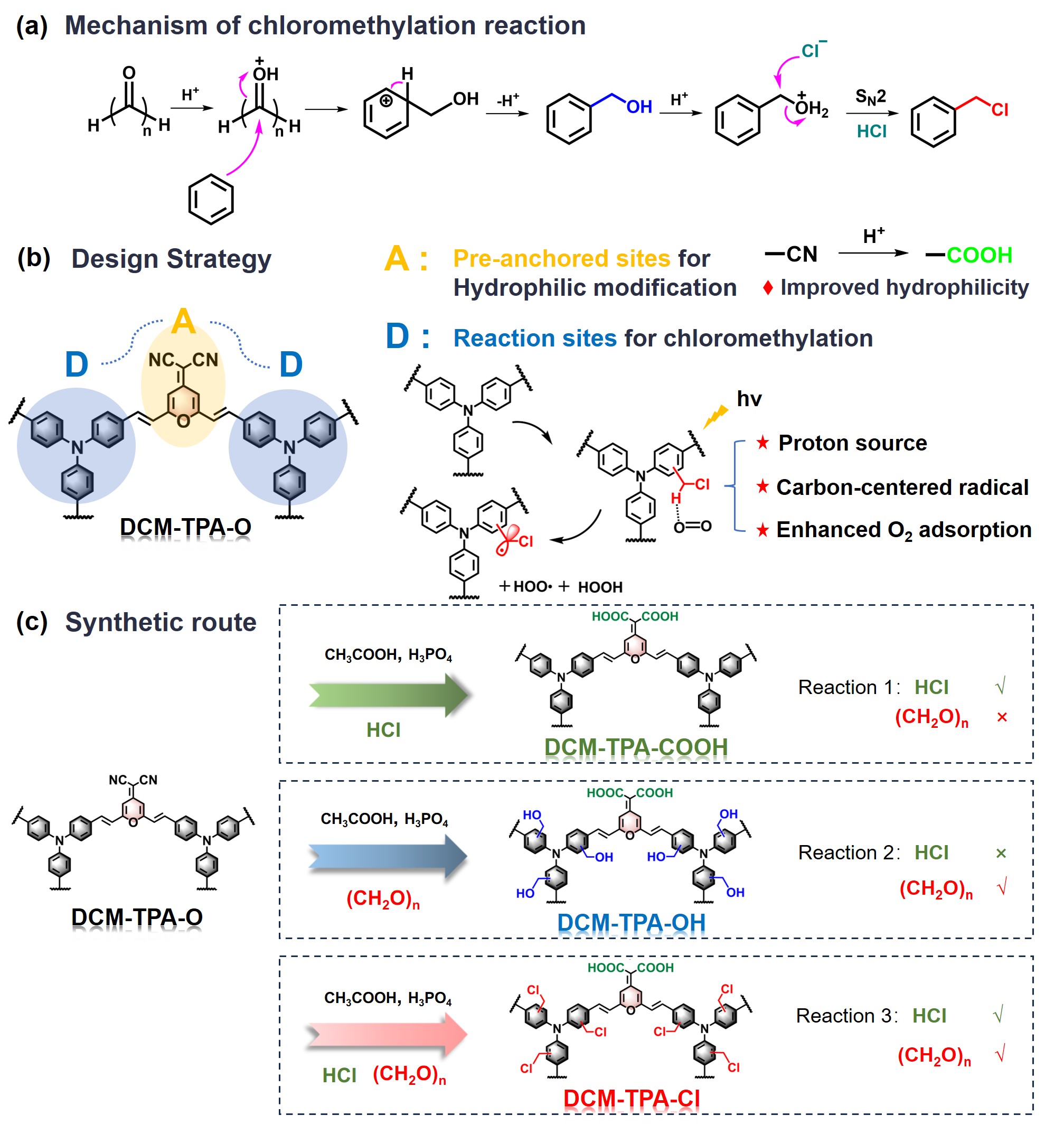 (1)針對氧氣吸附能力不足的問題,在CMPs材料中通過后修飾反應引入吸電子基團是解決此問題的好方法(圖1)。在之前的工作中引入磺酸基和季銨鹽(Adv. Funct. Mater.2025, 35, 2415244)的基礎上,我們首次將氯甲基引入CMPs中用于高效生產H2O2。在聚合物催化劑的制備中,氯甲基修飾的聚合物常用作傅-克烷基化等交聯(lián)反應的中間體,因其疏水性而未在光催化產H2O2領域引起重視。經典的Blanc氯甲基化反應常用聚甲醛和鹽酸為氯甲基化試劑,磷酸或冰醋酸等為縮合劑?;诖?,我們在材料設計中以三苯胺為反應位點,以氰根為酸化位點,通過一步氯甲基化反應,同時引入氯甲基和羧基,分別用于增強氧氣吸附和改善親水性。經氯甲基修飾的CMPs在純水和空氣中的產H2O2速率達到5.0 mmol g-1 h-1,在氧氣氛圍中的性能僅增長1.8%,證明其氧氣吸附能力之強。而在苯甲醇和水的混合溶劑中性能更是達到了38.0 mmol g-1 h-1,超過大多數(shù)目前已報到的催化劑。該工作以Chloromethylation modified pyranonitrile-based conjugated microporous polymers for selective one-step two-electron O2 reduction to H2O2為題,發(fā)表在化學領域頂級期刊Angew. Chem. Int. Ed.2025, 64, e202508436。