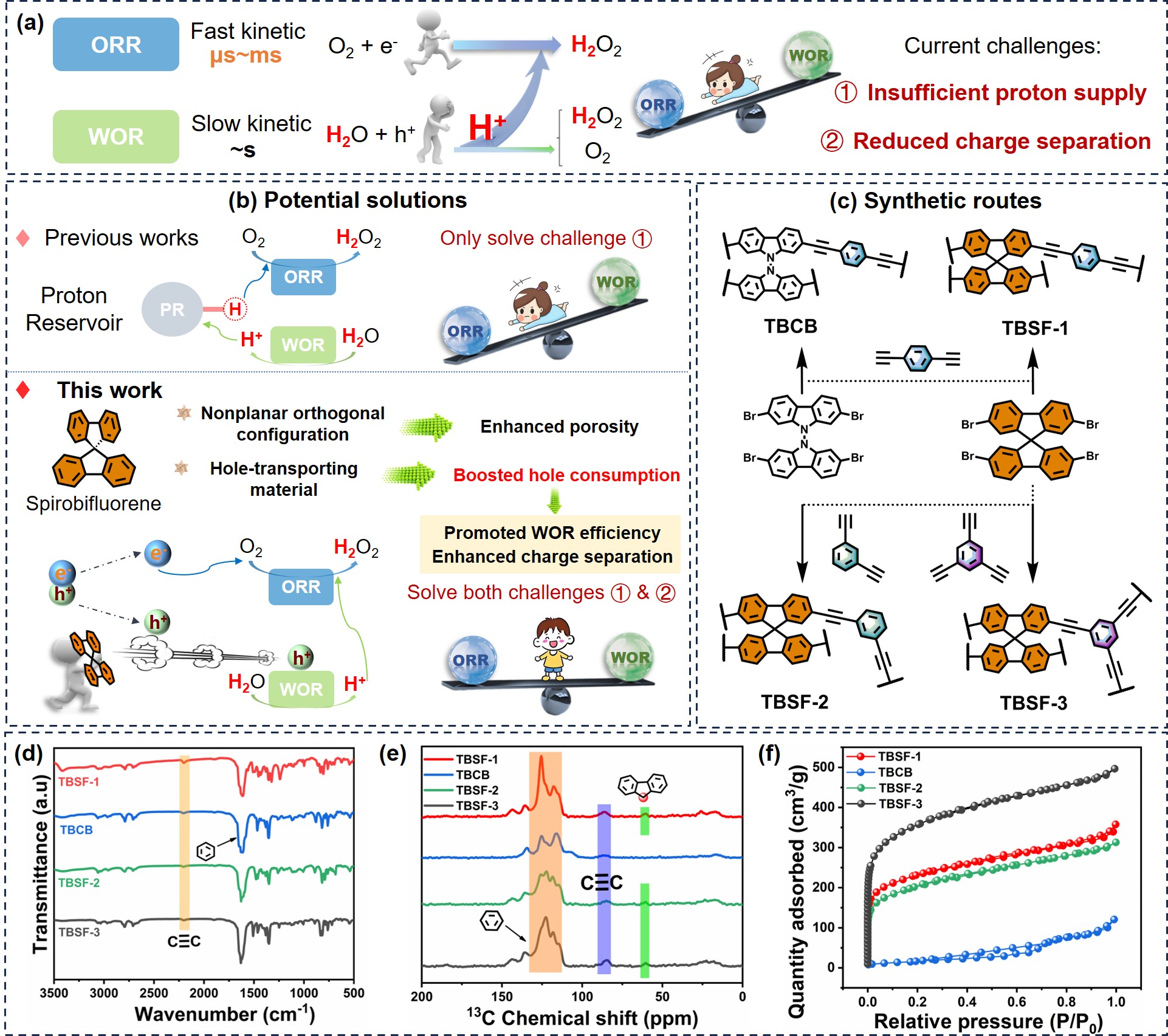 (2)針對質子供應有限的問題,我們在之前的工作中(Chem, Sci.2025, 16, 8577-8587)提出“質子海綿”的概念,直接給氧還原反應(ORR)供質子,來解決“質子悖論”問題。但該策略并未有效抑制光生載流子的復合和提高電荷傳輸能力。為此,我們提出直接提高水氧化反應(WOR)性能的策略,以螺二芴分子為構筑單元合成COPs催化劑(圖2)。螺二芴具有正交的空間構型,是高效的空穴傳輸材料,基于其的COPs具有諸多優(yōu)點,例如WOR性能大幅度提高以產生更多質子,滿足ORR較快的動力學需求;加速空穴消耗,抑制載流子復合;獨特的正交電荷傳輸通道更是加速了電荷的傳輸。因此,這類COPs催化劑在純水和空氣中的產H2O2速率達到9.29 mmol g-1 h-1,在氮氣氛圍中也能達到3.28 mmol g-1 h-1。該工作以Orthogonal Configurative Spirobifluorene-Based Conjugated Organic Polymers for Enhanced Water Oxidation Reaction to Boost H2O2 Photosynthesis為題,發(fā)表在材料學領域頂級期刊Adv. Funct. Mater.2025, e18050。