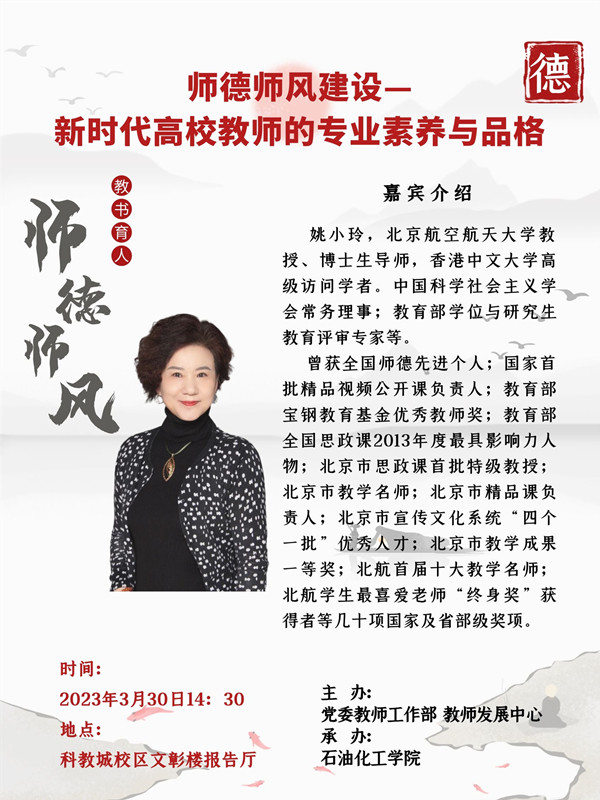 | 【學術講座】師德師風建設——新時代高校教師的專業(yè)素養(yǎng)與品格 姚小玲 北京航空航天大學教授 |