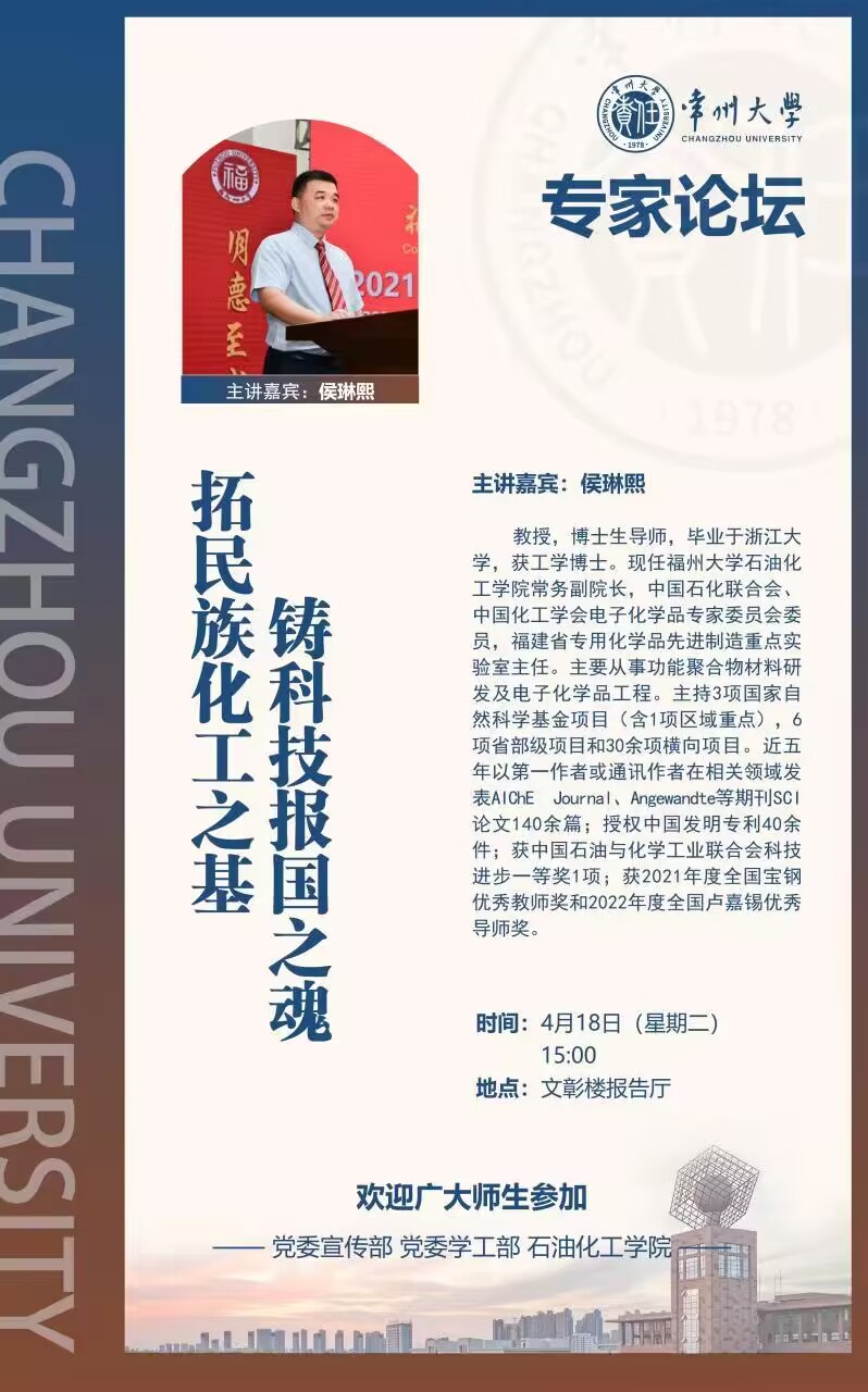 【學術講座】4月18日常州大學專家論壇:拓民族化工之基 鑄科技報國之魂