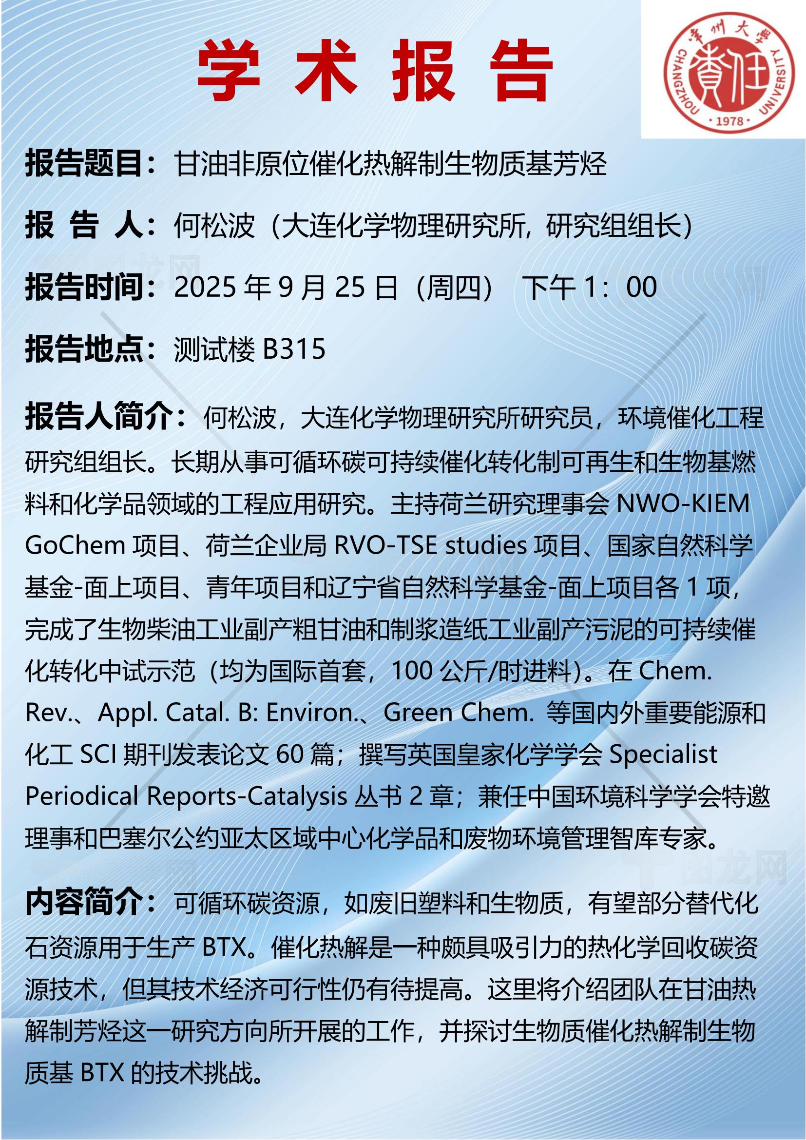 【學術報告】9月25日甘油非原位催化熱解制生物質(zhì)基芳烴