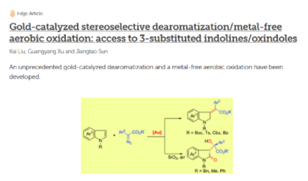 近日,石油化工學(xué)院孫江濤教授課題組在化學(xué)頂級期刊《Chemical Science》上發(fā)表題為“Gold-catalyzed stereoselective dearomatization/metal-free aerobic oxidation: access to 3-substituted indolines/oxindoles”的通訊文章,這是我校在此期刊上發(fā)表的第一篇通訊論文。Chemical Science是英國皇家化學(xué)會(the Royal Society of Chemistry)的旗艦期刊,報道化學(xué)學(xué)科原創(chuàng)性研究成果,是化學(xué)綜合領(lǐng)域最有影響力的三大期刊之一,也是國際上衡量科研小組研究水平的重要標(biāo)志性期刊。 原文連接:http://pubs.rsc.org/en/content/articlelanding/2018/sc/c7sc04086e#!divAbstract |