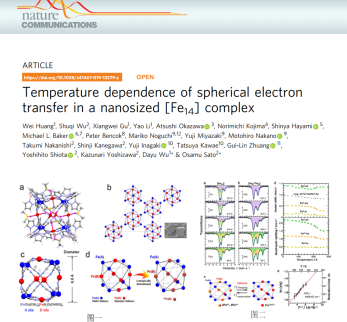 近日,我校石油化工學(xué)院吳大雨教授團(tuán)隊(duì)在合成和表征新型無機(jī)納米團(tuán)簇及其電子行為研究方面取得重要進(jìn)展,在Nature Communications(自然通訊)發(fā)表了題為“Temperature dependence of spherical electron transfer in a nanosized [Fe14] complex”(DOI: 10.1038/s41467-019-13279-y)的原創(chuàng)性論文(文章鏈接:https://www.nature.com/articles/s41467-019-13279-y)。Nature Communications期刊是Nature出版集團(tuán)旗下的國(guó)際頂級(jí)綜合性學(xué)術(shù)期刊,該項(xiàng)成果以常州大學(xué)為第一署名單位。近年來,吳大雨教授課題組致力于分子基材料跨學(xué)科研究,所涉及的學(xué)科方向包括化學(xué)、材料學(xué)、物理學(xué)與光電子等。該項(xiàng)工作應(yīng)用金屬-有機(jī)自組裝策略,合成了高核鐵原子納米團(tuán)簇,通過精準(zhǔn)調(diào)控團(tuán)簇表面的自由電子觀察分子水平上多電子轉(zhuǎn)移,顯示出分子基材料在電子轉(zhuǎn)移活性催化材料、單分子磁體、高密度信息存儲(chǔ)等領(lǐng)域的巨大應(yīng)用潛力。其亮點(diǎn)不僅在于成功合成氰橋高核鐵納米團(tuán)簇,同時(shí)結(jié)合多種表征方法和理論計(jì)算清晰表征團(tuán)簇球殼表面的電子轉(zhuǎn)移活性位點(diǎn),其作為電子化合物屬性是一類具有特殊性能的量子材料,其中過剩電子被限域在團(tuán)簇殼層表面并充當(dāng)陰離子,對(duì)電子傳輸和材料的催化、電磁等性能起關(guān)鍵作用。 論文第一作者為黃薇教授,碩士生顧祥偉、李堯等參與該項(xiàng)工作。石油化工學(xué)院吳大雨教授和日本九州大學(xué)Osamu Sato教授為共同通訊作者,組織了來自3個(gè)國(guó)家、11家研究單位的21位國(guó)際合作者,包括東京大學(xué)、九州大學(xué)、熊本大學(xué)、英國(guó)曼徹斯特大學(xué)、華中科技大學(xué)和浙江工業(yè)大學(xué)等多家著名大學(xué),獲得了同步輻射、穆斯堡爾譜、高頻電子順磁共振等儀器設(shè)備的測(cè)試支持,為該項(xiàng)工作提供嚴(yán)謹(jǐn)、翔實(shí)的實(shí)驗(yàn)數(shù)據(jù)。項(xiàng)目歷時(shí)3年多,得到了國(guó)家自然科學(xué)基金、日本戰(zhàn)略性研究推進(jìn)事業(yè)JST-CREST(催化創(chuàng)新項(xiàng)目)、九州大學(xué)海外客員教授研究課題、江蘇省綠色催化材料重點(diǎn)實(shí)驗(yàn)室自主課題以及青藍(lán)工程等項(xiàng)目資助。該項(xiàng)工作是常州大學(xué)首次以第一作者和第一通訊單位在Nature子刊上報(bào)道科研成果,對(duì)提升我校的學(xué)科水平、促進(jìn)高質(zhì)量發(fā)展具有重要意義。 |